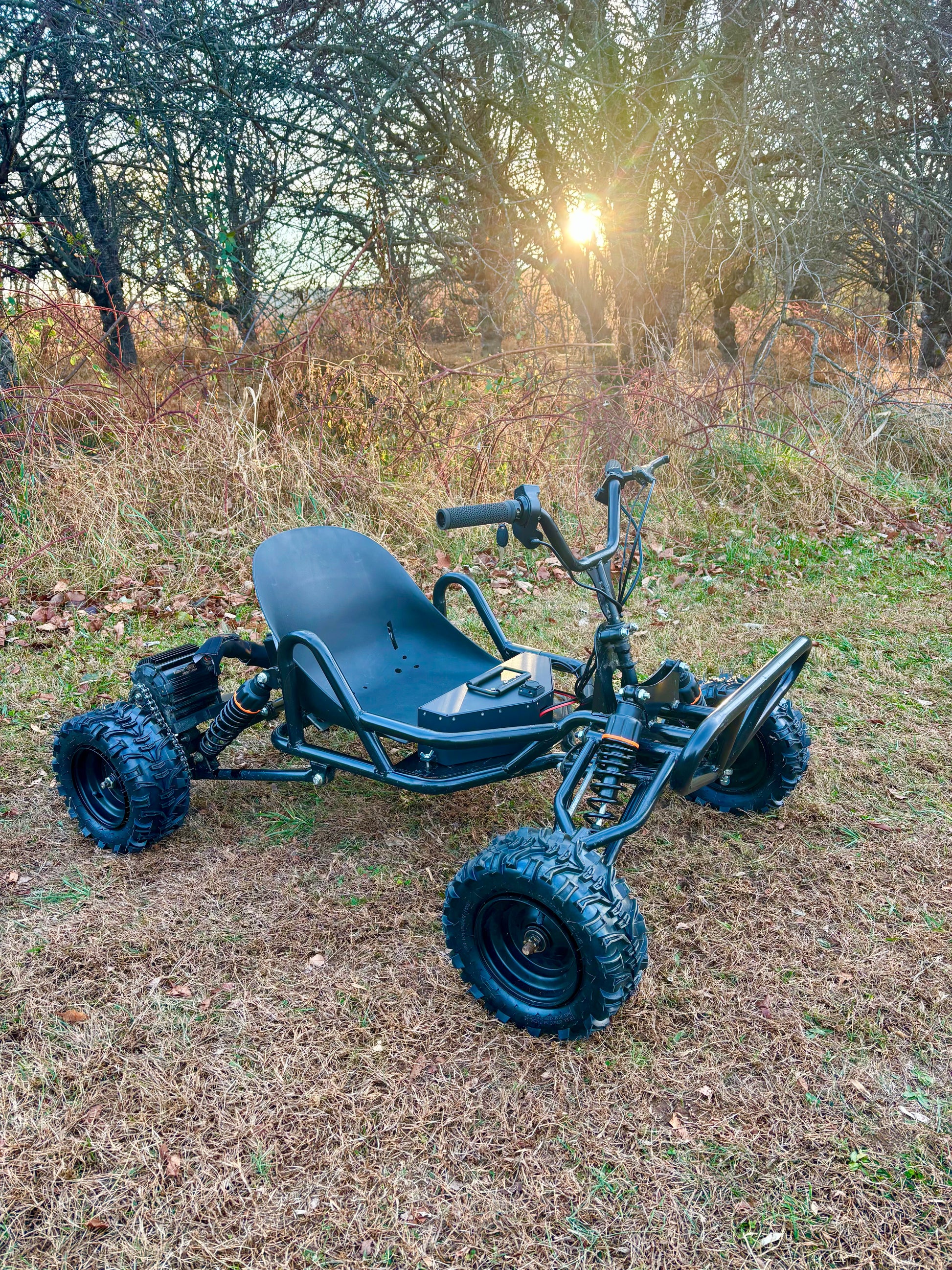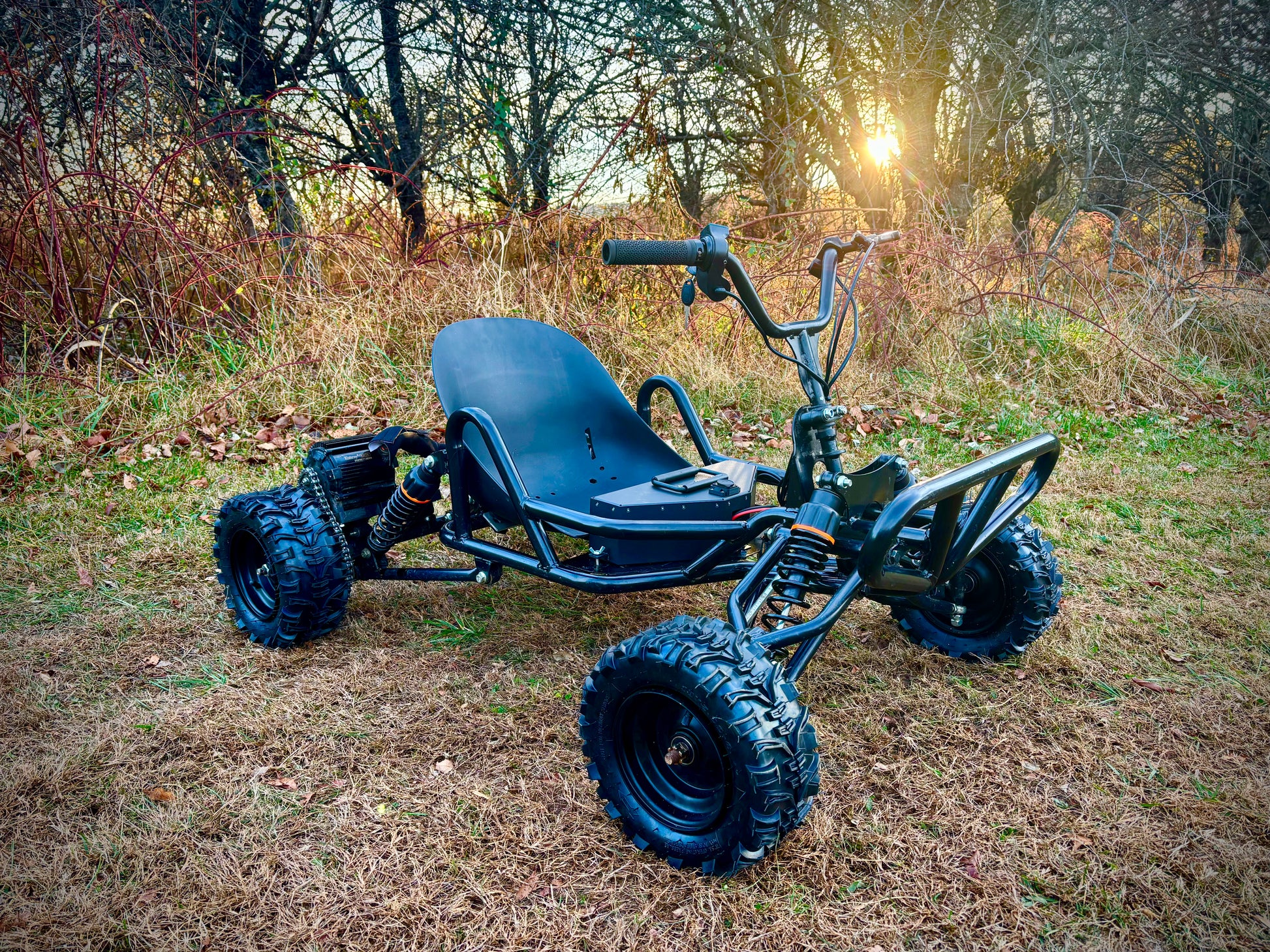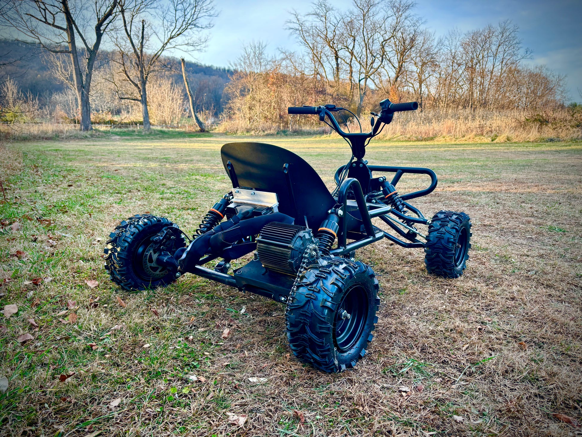 The CAB Yardy is the little bro of our two new four wheeled fun machines joining the CAB family, but don't be fooled the Yardy is like no other gokart you have ever ridden. The Yardy will spin the wheels or do a small wheelie on launch and climb any hill you would want to. With full suspension the Yardy eats up any terrain you throw at it and is light enough to pick up and carry with a stock ride time of about 30 minutes and a hot swapable fast charging state of the art 72V battery pack. With a top speed of up to 35 MPH, the Yardy is fast enough to be fun for everyone.